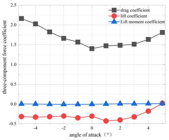 In the static wind calculation, the facilities such as the bridge deck guardrail in the bridge state are simplified by the equal ventilation rate, and other components are also ignored. As shown in Figure 10, the static wind three-component force coefficients of the beam under the static wind in the range of −5–5° attack angles of the wind axis are calculated.