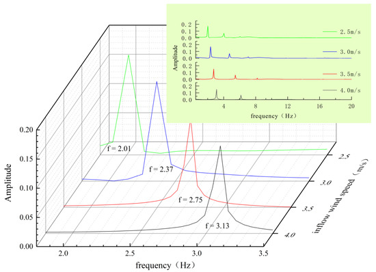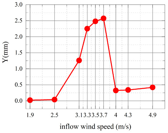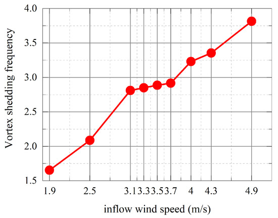 From Figure 14, it can be seen that the π-type beam has a large amplitude in the wind speed range from 2.5–4 m/s and the vibration amplitude reaches the maximum when the wind speed is 3.7 m/s. As can be seen from Figure 15, within the wind speed range of 3.0–4.0 m/s, the vortex shedding frequency changes little and is close to the vertical intrinsic frequency of the main beam, i.e., the “locking phenomenon” occurs.
