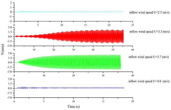 For vortex-induced vibration, there is an article [25] that shows that when the fundamental frequency ratio of torsion is greater than 1.4, it is difficult to generate bending-torsional coupled vibration, and the two forms of vortex vibration are independent of each other. According to Table 3, it can be seen that the fundamental frequency ratio of torsion and bending is 1.52, and the fundamental frequency of the two is quite different. According to the characteristics of vortex-induced vibration, the vertical bending vortex vibration will occur before torsional vortex vibration. Therefore, the vertical degree of freedom vortex vibration is simulated in the paper. The average value of St is estimated to be about 0.06 according to the results of Figure 12, and the wind speed during vortex-induced vibration is estimated to be 3.6 m/s. Therefore, the vortex-induced response calculation is performed for nine wind speed conditions near the wind speed. To ensure that the vortex-induced vibration solution captures the vortex, the time step for the eddy vibration calculation is taken to be the same as that for stationary winding. As shown in Figure 13, the time-history curve of the wind-induced vortex vibration amplitude corresponding to the onset wind speed, the maximum wind speed, and the end of the vortex vibration is given.