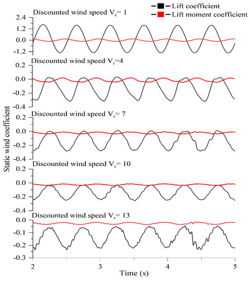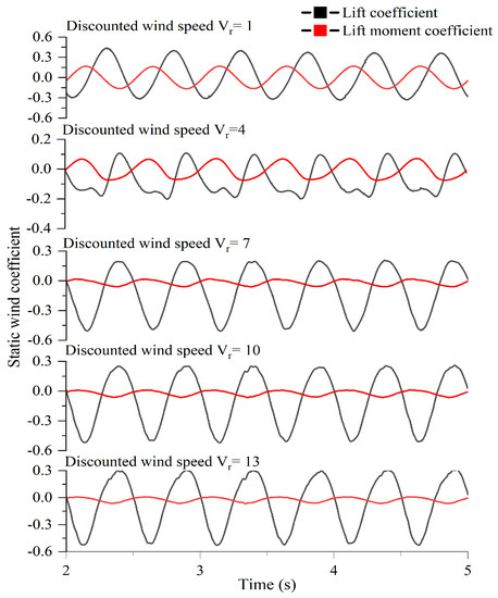 In the simulation, the beam is made to undergo small amplitude forced vibration, in which the frequency is set to 2 Hz, the amplitude is 0.02 m, and the phase is 0° when performing the single degree of freedom vertical bending forced vibration. To perform the single degree of freedom torsional forced vibration, set its frequency f to 2 Hz, amplitude 4°, phase 0°. These vibration parameters are written as UDF files to interface with Fluent to achieve sinusoidal variations in vibration. Based on the wind field characteristics at the bridge site, the incoming wind speeds U were calculated to be 1.256 m/s, 5.026 m/s, 7.896 m/s, 12.566 m/s, and 16.336 m/s, corresponding to converted wind speeds Vr of 1, 4, 7, 10, and 13, for a total of five calculated wind conditions. All calculations were performed at 0° wind angle of attack with the same time step of 0.001 s. The time curves of the lift and lift moment coefficients of the π-type beam extracted under the five calculated wind speed conditions are shown in Figure 17 and Figure 18.