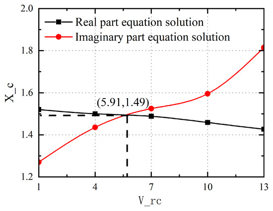 The critical wind speed is calculated by the Scanlan two-dimensional flutter calculation method, and the relevant parameters of the calculation are shown in Table 6. Based on the calculated flutter derivatives, the effective solutions of the real part equation and the imaginary part equation for the bridge at five converted wind speeds were obtained by preparing a calculation program through MATLAB, and then the curves of the solutions were plotted. Curves’s intersection point is the critical state of the flutter, and the graphical results are shown in Figure 19.