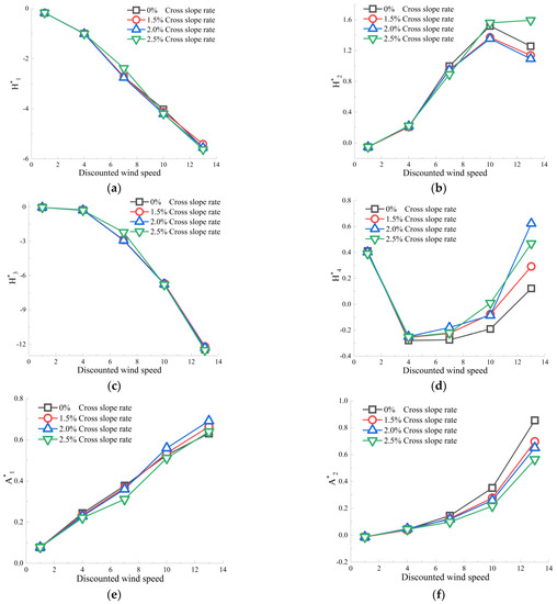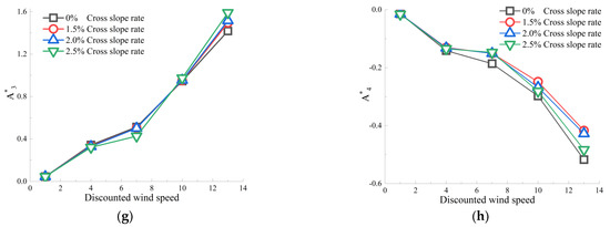 Variation of aerodynamic derivative with the discounted wind speed for different bridge deck cross slope ratios. (a) variation of aerodynamic derivative of H*1. (b) variation of aerodynamic derivative of H*2. (c) variation of aerodynamic derivative of H*3. (d) variation of aerodynamic derivative of H*4. (e) variation of aerodynamic derivative of A*1. (f) variation of aerodynamic derivative of A*2. (g) variation of aerodynamic derivative of A*3. (h) variation of aerodynamic derivative of A*4.
