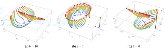 Figure 1 shows the structure of the approximate roots of degenerate q-tangent polynomials. Here, we impose the conditions and . Figure 1a,b show the structure of the approximate roots for and , respectively. The approximate structure of degenerate q-tangent polynomials when h is is shown in Figure 1c.