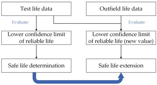 However, the MLG’s life data from the fatigue test and outfield service are right-censored, making the statistical inference challenging. Although several algorithms such as maximum likelihood and Bootstrap have been developed to estimate confidence limits of reliability characteristics with censored life data, the estimates are generally approximate [27]. Bayesian is effective for small-sample cases but is limited by the selection of prior distribution [30,31]. This paper adopted the fiducial distribution inferred from the test life data as the prior distribution. Thus, the objectivity of Bayesian inference was ensured. Based on that, the MLG’s safe life extension process is given below.