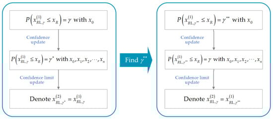 Afterward, adjust the value of in Equation (12) to until the calculated in Equation (8) is equal to the required value of . In other words, find the value of such that . In this case, the lower confidence limit of the MLG’s logarithmic reliable life with the required confidence and reliability can be updated from to , where