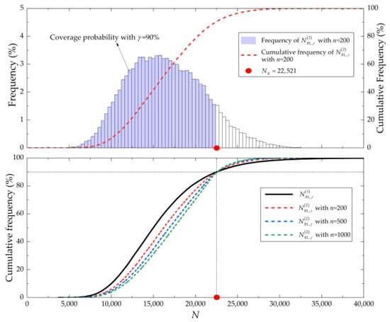 Figure 6 and Figure 7 illustrate the simulation results of the MLG’s safe life determination and extension in Simulation No. 1 and No. 2, respectively. In the figures, the block represents the frequency of () in 50,000 MC simulations. The black solid line, red dotted line, blue dotted line, and green dotted line represent the cumulative frequencies of , (), (), () in 50,000 MC simulations, respectively. It could be found that although the values of and were different, and could be both guaranteed with the required confidence (0.90 in Figure 6 and 0.95 in Figure 7). The above results proved the correctness of the proposed method.