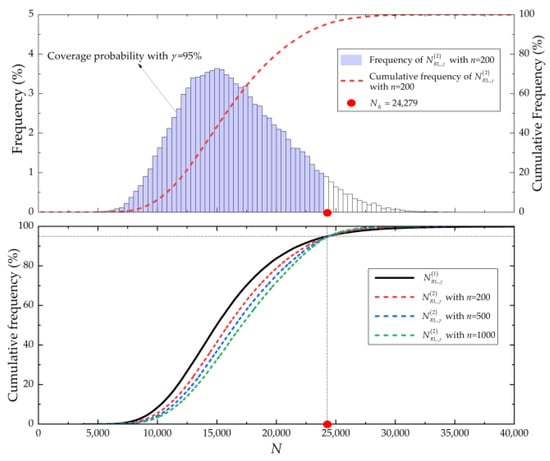 Assume that the MLG’s life follows a lognormal distribution, a commonly used asymmetric life distribution [27,28], and the test life is . Then, the lower confidence limit of the MLG’s reliable life with the confidence and reliability can be determined by [1,18]