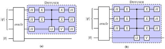 The classification process involved 20 iterations of each of the three quantum search algorithms on the input datasets. The superpositions provided in Equations (1) and (2) are used to classify patterns using Grover, as in Figure 1a, partial diffusion, as in Figure 1b, and fixed-phase operators. However, the phase-inversion superposition is used in the aforementioned form in Equation (3) for Grover’s operator and the partial diffusion operator, where the phase of patterns in P shifts to .