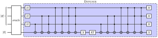 Moreover, the partial diffusion operator showed close results obtained at the 16th iteration, presented in Table 8; when applied to the same input state, the probability of classification was 99.95%, and the probability of irrelevant classification was 0.023%, resulting in a conditional probability of 99.98%. This shows that the partial diffusion operator’s results are slightly lower than Grover’s in this particular case in which only the desired pattern is phase-inverted.