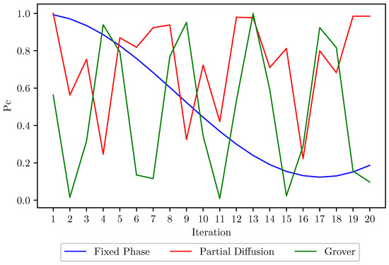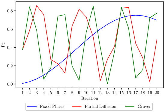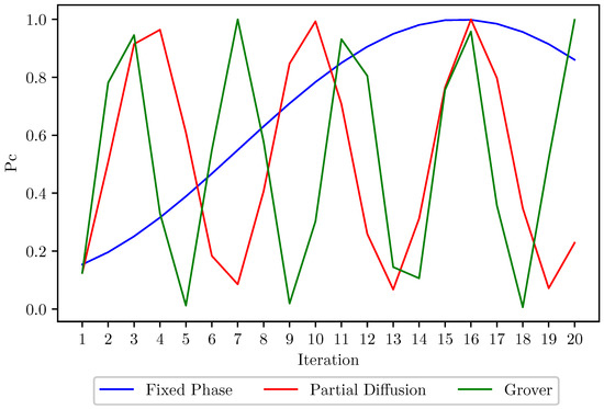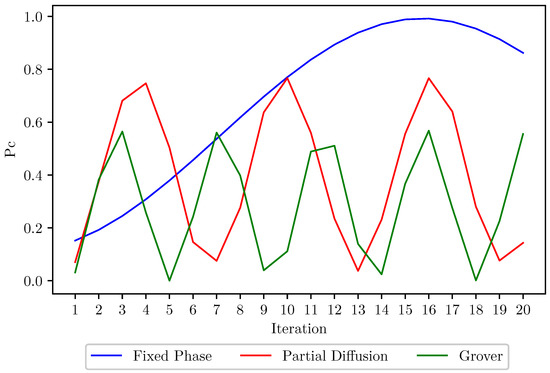 To illustrate this, Figure 6 shows a comparison of the three quantum search operators used and their effect on the probability of correct classification . Similar to , in , the probability of correct classification measured after applying iterations of Grover’s operator or the partial diffusion operator maintained a periodic fluctuating behavior, unlike the fixed-phase operator, which increases the probability of correct classification in a gradual manner.