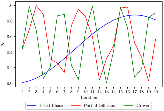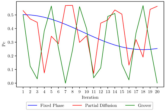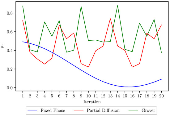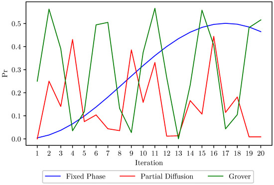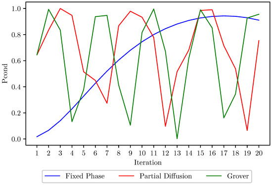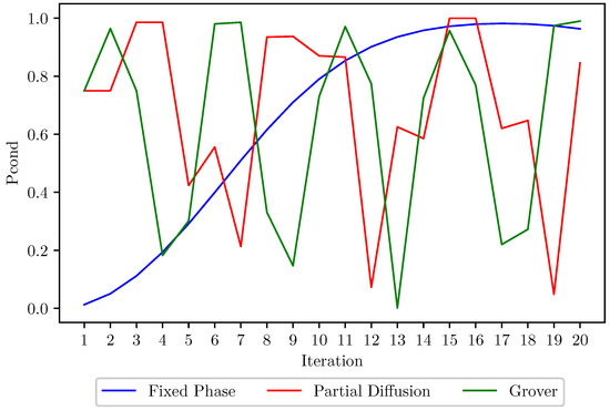 Hence, the conditional probability of classification demonstrated in Figure 10b shows that Grover’s operator had the maximal value in the 7th iteration, whereas the partial diffusion and fixed-phase operators had maximal values in the 16th iteration, with only a 0.1% difference between the highest and lowest values of conditional probability for the three algorithms.