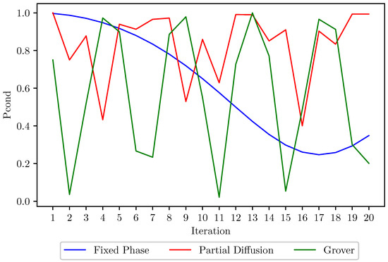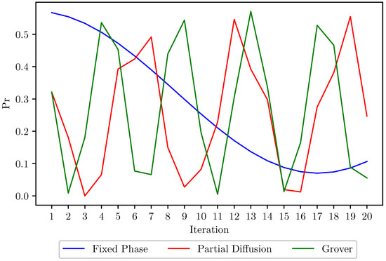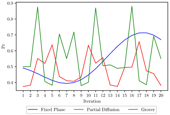 Figure 16 illustrates the probability of correct classification measured in 20 iterations after applying Grover’s, the partial diffusion, and the fixed-phase algorithms. This shows the expected behavior of the three operatorsm in which Grover’s operator and the partial diffusion operator resulted in a fluctuating value of , and the fixed-phase operator resulted in gradual progress. Although Grover’s and the partial diffusion values for are close, the partial diffusion operator outperforms Grover’s operator in the third iteration of application, achieving the highest value for across all operators.