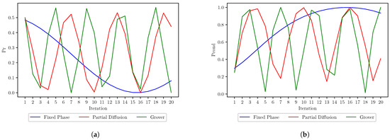 Finally, Figure 18 shows the conditional probability of classification; the maximal result of was found at the 16th iteration of the partial diffusion operator, with a very close difference to Grover’s and the fixed-phase operators.