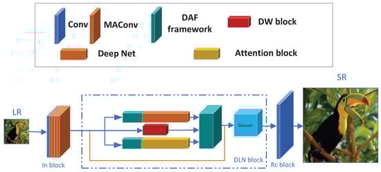 If we denote the In block as and the input of In block is the LR image (), the output of In block is shown in Equation (1):