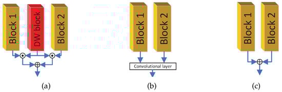 The Dynamic Weighting method: there are three typical feature fusion methods, as shown in Figure 3. (1) Figure 3b is Convolutional-based fusion, the Convolutional layer can learn optimal parameters according the training data. This strategy, which is flexible without a priori knowledge, is a widely used fusion strategy, but there are two shortages: (a) The Convolutional layer only focuses on the local features (receptive field depends on the kernel size, usually ). (b) Inappropriate initial values for the Convolutional layer will result in difficulty in training. In extreme situations, it will cause one branch gradient to vanish. (2) Figure 3c is adding two branches’ outputs with fixed weight values (usually the same weight values as 0.5); this strategy can get rid of the one branch gradient vanishing problem, and ingenious weight values will greatly improve the performance of the network, but there are two shortage: (a) Fixing the weight values heavily rely on experience and a priori knowledge, simply set same weight values as 0.5 may not suitable for all the network. (b) The fixed weight values are not fit for the Feedback-based feature fusion due to the weight values varied under different inputs and iterations.