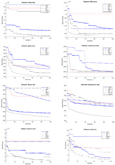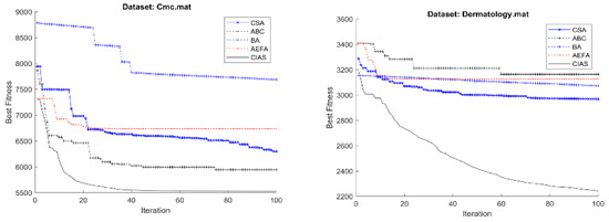 In this section, the first chaotic map-based IAS (IAS-1), called CIAS, is compared with other basic metaheuristic algorithms in terms of different statistical criteria. The results of other evaluations and comparisons are given below. The results related to the convergence rate of the proposed model and comparative metaheuristic algorithms implemented on 10 datasets are shown in Figure 4.