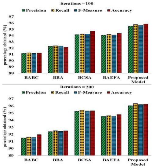 Compared to previous algorithms, the proposed model performed significantly better in Recall, precision, accuracy, and f-measure, as evidenced by the experiment’s findings. Within the search space, the implementation of BIAS investigates regions that are relatively close to optimum global values. During the exploration and exploitation phases, the BIAS versions search the most promising area of the search space. According to the results of BIAS’s search history analyses, the distribution of candidate solution points around the global optimal is greater than that of BCSA. Figure 5 compares the performance of BIAS with other algorithms based on recall, precision, f-measure, and accuracy.