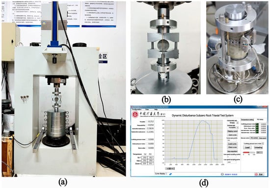 As shown in Figure 1, the equipment is a rock mechanics test system [28]. Therefore, the system can perform conventional uniaxial and Brazilian tests. The axial deformation is measured by two MHR500 LVDTs, with a measurement range of 0~12 mm and a resolution of 0.0001 mm. The axial load is measured by a ZLF-D loading sensor, with a load range of 0~500 kN and a force-measuring resolution of 10 N.