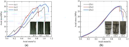 Stress-strain curves of (a) rock-like material specimens and (b) sandstone specimens.