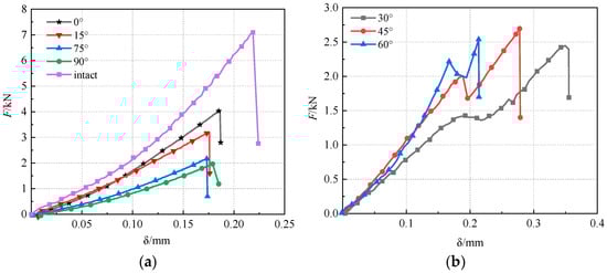 The load-displacement curves of the intact disc specimens and the fissured disc specimens are shown in Figure 6 (δ represents the displacement). Compared with the intact specimen, the peak strength and slope of the load-displacement curves of the fissured disc specimens have a larger decrease, and the fissures significantly weaken the stiffness and strength of the specimens.