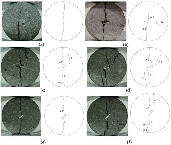 The dip angle of the flaw affects the failure mode of the disc specimens. According to Figure 10, the failure modes of the Brazilian disc specimens with a single flaw can be divided into three types: (1) Wing cracks penetration mode (α = 15°, 30°, 45°, 60° and 90°), the failure mode showed two forms. The first form was that two wing cracks with tensile characteristics appeared from the tip of the pre-flaw (α = 45° and 90°), and wing cracks eventually penetrated the whole specimen. The second form consists of a wing crack that originates from the tip of the flaw and a tensile crack with the direction of expansion opposite to the direction of the wing crack originating from the middle of the flaw (α = 15°, 30° and 60°). This form is similar to the previous one, but the cracks originate in the middle of the flaw due to internal defects. (2) Tensile-shear penetration mode (α = 75°), consisting of two tensile and shear cracks. Therefore, the failure of the specimen was caused by the propagation and penetration of the shear cracks and the tensile wing cracks. (3) Radial penetration failure mode (α = 0°), this failure mode is similar to the intact disc specimen, which generated penetrating tensile cracks in the middle of the specimen. However, in the radial penetration failure mode, the cracks originated from the pre-flaw. In contrast, for the intact disc specimen, the cracks were randomly generated in the middle of the specimen.