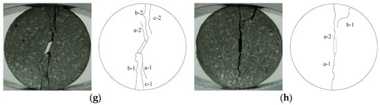 According to the load-displacement curve for the disc specimen with a 75° flaw dip angle, as shown in Figure 8, when the load reached the initial cracking load (F = 1.5 kN), the wing cracks a−1, and a−2 originated from the tip of the pre-flaw. The initiation and growth of secondary cracks b−1 and b−2 occurred after the formation of the wing crack and were accompanied by a large number of microcracks. When the load reached the peak value (F = 2.2 kN), the secondary cracks b−1 and b−2 extended to the vicinity of the flaw tip. The far-field cracks c−1 and c−2 also initiated from the boundary and penetrated the main cracks, and the brittle failure occurred in the specimen.