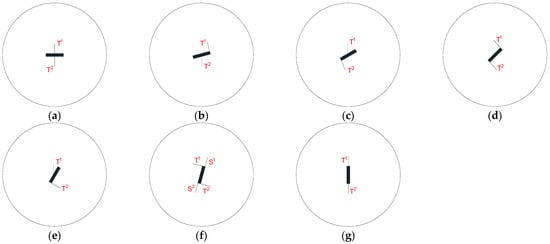 Crack propagation type in Brazilian disc with a single flaw, (a) α = 0°, (b) 15°, (c) 30°, (d) 45°, (e) 60°, (f) 75° and (g) 90°.
