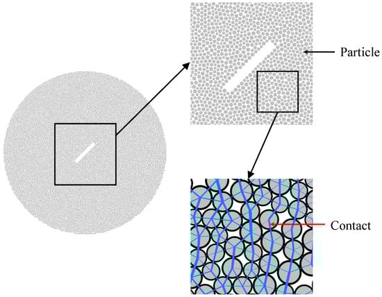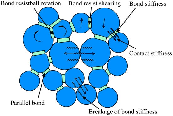 where, is a linear force, is a cushioning force, is a parallel bond force, and is a parallel bond moment. When the contact force Fc and moment Mc calculated according to Equations (2) and (3) is greater than the critical value, it is determined that the parallel bond breaks and the elastic interaction provided between the two particle surfaces disappear, indicating that the “contact” is broken.
