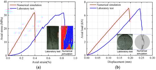 Numerical simulation was carried out for the aforementioned uniaxial compression test and Brazilian test. The simulation results were close to the laboratory test results, which verified the correctness of the microscopic parameters, as shown in Figure 13. Moreover, the uniaxial compression failure mode of rock specimens obtained by numerical simulation was similar to the laboratory test, which was all splitting failure. The failure mode of the Brazilian disc obtained by numerical simulation also agrees well with the laboratory test results.