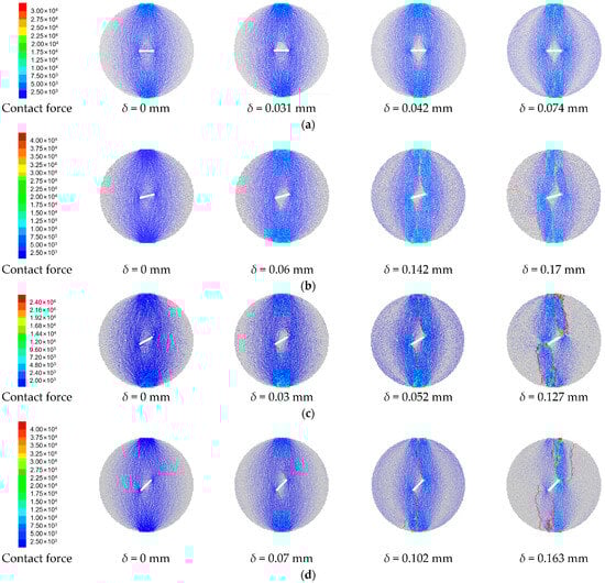 Figure 15f shows the evolution distribution of microcracks and force chains in the model specimen with a flaw dip angle of 75°. According to the crack number evolution curve (see Figure 17), the whole damage evolution process of the model specimen can still be divided into four stages. First, when the load was less than the initial cracking load (1.5 kN), there was no microcrack development inside the disc specimen. When the load was increased to the initial cracking load (marked as point A), microcracks germinated along the flaw and gradually extended to the loading end. Finally, when the load reached the peak value (marked as point C), the wing crack sprouted at the tip of the flaw has extended to the disc boundary, the number of microcracks increased rapidly, and a large number of far-field cracks began to sprout at the disc boundary (marked as point D). The ultimate failure of the disc specimen was caused by the propagation of the wing crack.