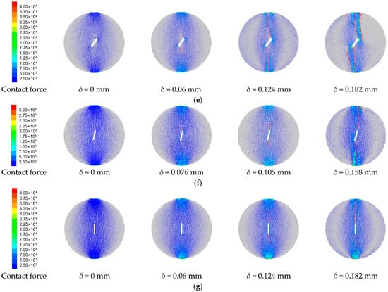 The evolution laws of contact force and crack, (a) α = 0°, (b) 15°, (c) 30°, (d) 45°, (e) 60°, (f) 75° and (g) 90°.