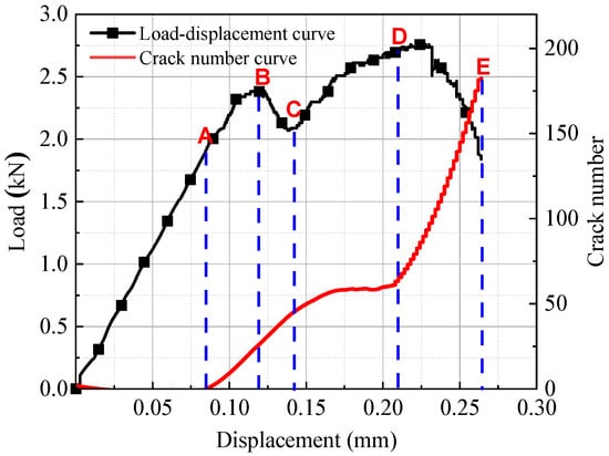 For crack evolution analysis, model specimens with flaw dip angles of 45° and 75° were used as examples. Figure 15d shows the evolution distribution of microcracks and force chains in the model specimen with a flaw dip angle of 45°. The evolution curve of the number of cracks in the model specimen during loading is shown in Figure 16. It can be found that the load-displacement curves obtained from the simulation are consistent with the results of the laboratory test, both of which have two load peaks and belong to progressive failure. When the load reached the crack initiation load (marked as point A), a contact force concentration appeared at the tip of the flaw, and a small number of wing cracks began to sprout. With the expansion of the wing crack, the contact force concentration at the tip of the flaw was increasing, and the contact force was continuously approaching the loading line. When the load increased to the first peak value (marked as point B), the wing cracks extended to the upper and lower boundaries of the disc. From point B to point C, the load decreased slightly, and the growth of micro cracks within the disc specimen came to a standstill, with only a small number of far-field cracks sprouting locally at the specimen boundary, which was caused by the rise in contact force within the boundary region. When the load rose to point D, the number of cracks started to rise rapidly, and the rate of rise was much greater than the A–C section. The cracks sprouted at the model boundary increased and quickly expanded to the flaw, and the failure of the disc specimen appeared when the far-field cracks expanded to the vicinity of the pre-flaw (marked as point E).
