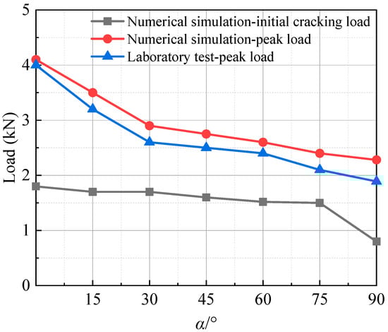 Figure 18 shows the variation law of peak load, and the initial cracking load with the flaw angle of the disc specimen was summarized. The peak load of a single flawed disc specimen decreases with increasing flaw angle. The simulation results were close to the laboratory test results, and the failure of the disc specimen was caused by the co-propagation of the wing crack and the far-field crack. As the flaw angle increases, the crack expansion path shortens, and the peak load decreases gradually. With the increase of the flaw angle, the angle between the flaw and the loading direction decreases, the hindrance to the development and expansion of the wing crack is weakened, and the initial cracking load decreases slowly. The initial cracking load has a significant drop at α = 90°, which means that the main stress characteristics of the crack changed at this time, and the crack was highly susceptible to expansion. According to the above analysis, the initiation and propagation of new cracks were mainly controlled by tensile stress at the flaw dip angle α = 0°, 15°, 30°, 45°, 60° and 90°. The initiation and propagation of new cracks were controlled by both shear stress and tensile stress at the flaw dip angle α = 75°. Since the constitutive model and boundary conditions of the sample in the laboratory test cannot be completely consistent with those of the sample in the simulation, it is allowed that there are some differences between the simulation results and the laboratory test results on the premise that the laws are the same. It should be noted that since the constitutive model and boundary conditions of the specimen in laboratory tests cannot be completely consistent with those of the specimen in simulation, it is allowed to have certain differences between the simulation results and the laboratory test results.