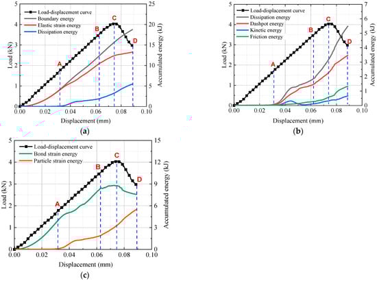 The PFC2D particle flow code implements the recording of the energy changes of the model specimen during the simulation. The energies monitored are boundary energy, viscous strain energy, friction energy, elastic strain energy, kinetic energy and material cracking and crushing energy. The dissipation energy composition of the model is complex and affected by various factors, which can be obtained from the difference between the total strain energy and the elastic strain energy . The elastic strain energy is composed of particle strain energy and bond strain energy , which is calculated as follows [33]: