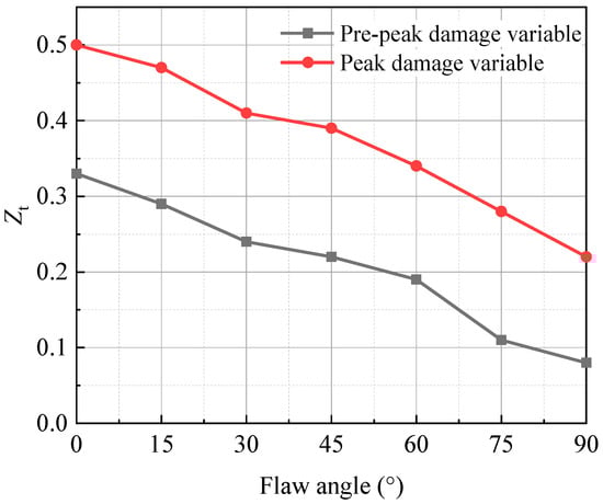 Figure 20 shows the relationship curves of the pre-peak damage coefficient and peak damage coefficient with the flaw dip angle. It can be seen that with the increase of the flaw angle, the pre-peak damage variable and the peak damage variable keep decreasing. This indicated that the larger the flaw angle was, the more damage to the model specimen was concentrated in the post-peak stage. A large number of microcracks were merged and penetrated. Macro cracks were rapidly formed at the post-peak. The model specimens were characterized by brittle failure.