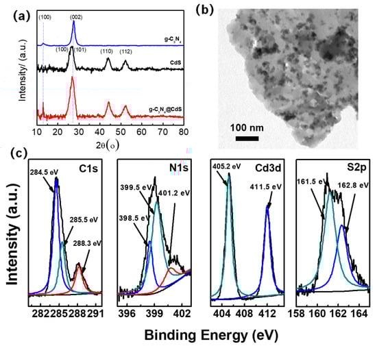 (a) XRD patterns of g-C3N4, CdS, and g-C3N4@CdS nanocomposites. (b) TEM image of g-C3N4@CdS nanocomposites. (c) High-resolution XPS spectra of C 1s, N1s, Cd3d, and S2p regions of g-C3N4@CdS nanocomposites.