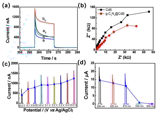 (a) Photocurrent responses of CdS (a, a0) and g-C3N4@CdS/ITO electrode without (a,b) and with (a0, b0) 50 µM CySH. (b) EIS plots of CdS/ITO and g-C3N4@CdS/ITO at 0.0 V under 545 nm irradiation. (c) Photocurrent responses of g-C3N4@CdS/ITO at different potentials. (d) Photocurrent responses of g-C3N4@CdS/ITO at different wavelengths.