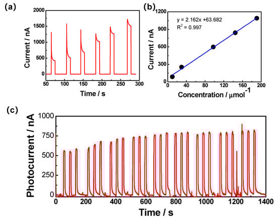 The working electrode was illuminated from the back (an illumination power on the working electrode of 73.89 mW/cm2), effectively preventing interference from the color sample. Each sample was detected three times, and the average value was calculated. The photoelectrocurrent was obtained using the following procedure: I = Ismpale − Iblank (Ismpale, the photoelectrochemical current of the sample; Iblank, the photoelectrochemical current without the sample).