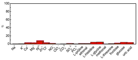 The selectivity of the photoelectrochemical sensor was confirmed by evaluating its photoresponse toward various probable interference species found in the detection solution containing 50 μmol L−1 CySH. In total, 1000 times Na+, K+, Ca2+, Mg2+, Zn2+, Ni2+, Cl−, NO3−, ClO4−, CO32−, SO42−, and PO43−; 500 times L-proline, ethanol, L-histidine, L-glycine, methanol, L-threonine, fructose, and glucose; and 100 times uric acid were texted. As shown in Figure 4, the results revealed that these species did not cause significant interference with the detection of CySH on the as-prepared g-C3N4@CdS-based photoelectrochemical platform.