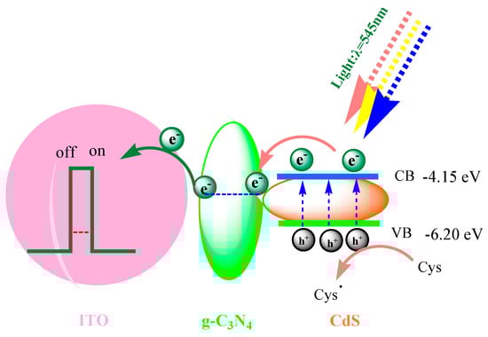 The as-prepared g-C3N4@CdS photoactive materials were further applied to design a photoelectrochemical platform for CySH sensing. As shown in Figure 2a, a photocurrent of 353 nA was observed on a bare CdS modified ITO electrode (CdS/ITO) in 0.1 M PBS under 545 nm light irradiation, whereas a photocurrent of 449 nA was observed on a g-C3N4@CdS modified ITO electrode (g-C3N4@CdS/ITO), indicating that the addition of g-C3N4 improves the photocurrent conversion efficiency of CdS. To explore the above reason, electrochemical impedance spectroscopy was conducted at 0.0 V under 545 nm light illumination. As shown in Figure 2b, the charge transfer resistance of g-C3N4@CdS/ITO was 189.7 kΩ, which is much smaller than that of bare materials (517.2 kΩ). This smaller arc radius implies a much higher charge transfer efficiency [23,25]. These results were supported by the data of photoluminescence spectra (Figure S2). Furthermore, after adding 50 µM CySH to the electrolyte solution, the photocurrent reached 994 nA on g-C3N4@CdS/ITO, nearly 2.1 times that of CdS/ITO. The increase in the photocurrent was attributed to the oxidization of CySH by the photogenerated holes, effectively avoiding electron–hole recombination. The photoelectrochemical process of g-C3N4@CdS/ITO for CySH oxidation is proposed in Scheme 1. Upon irradiation with light, CdS was excited and underwent charge separation to yield electrons (e-) and holes (h+). The photoelectrons can arrive at g-C3N4 through electron tunneling and subsequently to the ITO electrode [46,47,48]. Finally, the photocurrent was produced. When CySH was introduced, the h+ of the CdS could be refilled by electrons from the CySH, ensuring that the occupied holes were available for the following excitation. The photocurrent could be greatly improved by this process. It was noted that the intensity of the photocurrent was consistently enhanced by increasing concentrations of CySH, thus promising the quantitative determination of CySH.