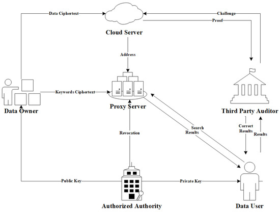 The system includes six types of entities, which are data owner (DO), data user (DU), cloud server (CS), proxy server (PS), attribute authorization center (AA), and third party auditor (TPA).