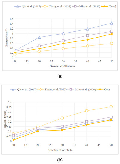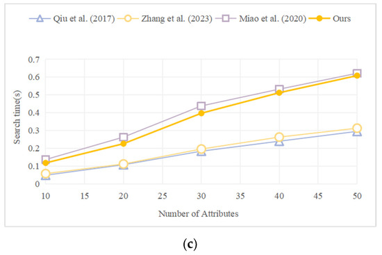 The experiments provide the results of the computational cost of the three main algorithms of the scheme, encryption, trapdoor generation, and search algorithms, and the results are shown in Figure 2. According to the experimental results in Figure 2a,c, it can be seen that the computational cost of the algorithms grows linearly with the number of attributes. In general, the use of an LSSS access structure is more efficient than that of a tree access structure, but the computational cost of the scheme in this paper is also smaller in overhead than a similar scheme [20] that uses a tree access structure. From Figure 2a, it can be seen that scheme [20] takes 0.698 s when , whereas our scheme takes 0.583 s. From Figure 2c, it can be seen that scheme [20] takes 0.448 s when whereas our scheme takes 0.393 s. According to the experimental results in Figure 2b, it can be seen that the scheme in this paper always maintains the lowest total computational overhead in the trapdoor generation phase. When , the time spent in the scheme [10] is almost twice as long as that in our scheme. At the same time, the time required for the decryption phase of the scheme in our scheme is a very small constant, independent of the number of attributes, which greatly reduces the computational overhead. In summary, the scheme in this paper is efficient and feasible in practical scenarios.