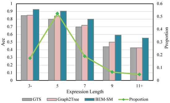 In addition, we tested the effect of the model on items with different expression lengths, as shown in Figure 3. The green broken line represents the proportion of items with different expression lengths. It can be observed that BEM-SM exhibits the best solution performance in all cases, and the gap between our model and other models is becoming larger in the case of long expressions (11+). To some extent, it proves that our model has more advantages for more complex problems.
