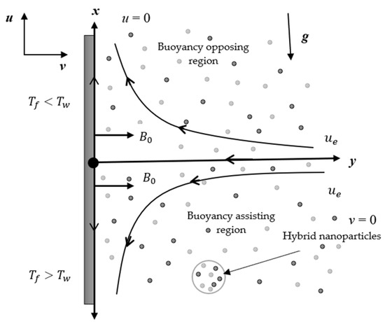Recently, researchers have been interested in approaching the mathematical study of HNF to include MF in different geometry, as can be found in the references [13,22,23,24]. Anuar and Bachok [25] also investigated the mathematical modeling of the unsteady flow of micropolar HNF along a deformable plate with the thermal radiation effect in the stagnation region. By using the Laplace transform method, Haider et al. [26] performed the investigation across an oscillating vertical plate with Newtonian heating. Apparently, the research on micropolar HNF is still few in the references. However, such studies can be further explored as their applications are of current and emerging interest to mechanicians, physicians, materials scientists as well as engineers. Thus, it is possible to consider the magnetic field in this micropolar hybrid nanofluid of its role in controlling the velocity of the fluid. Magnetic fields also are well acknowledged to play an essential function in engineering operations (MHD generators, pumps, nuclear reactors) and in the medical field (MRI, cancer diagnosis) [27]. Additionally, in current metallurgical and metal-working operations, the study of magnetohydrodynamic (MHD) flow and heat transfer of an electrically conducting fluid is of great interest. This research is also of tremendous interest because of the magnetic field’s effect on boundary layer flow control and the performance of various systems that use electrically conducting fluids. Sharma et al. [28] investigate the effects of MHD gyrotactic microorganisms and Arrhenius activation energy over an inclined stretching sheet that has applications in geothermal engineering, energy conservation, and the disposal of nuclear waste material. Recent studies on MHD flow include those of Sharma et al. [29], Ghandi et al. [30], Obalalu et al. [31], and Obalalu [32].