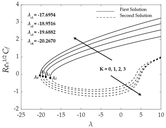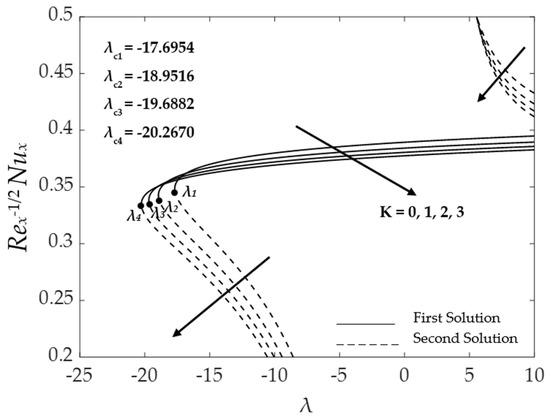 Figure 2 and Figure 3 illustrate the differences of and for some values of when , , and . These figures show that it is possible to obtain double outcomes of the similarity Equations (7) to (9) for both assisting and opposing flows, . Due to buoyancy forces, experiences a favorable pressure gradient, which accelerates the flow and causes a larger skin friction coefficient than in the non-buoyant scenario . The unique solution (negative values of ) and double outcomes in the range exist, but there is no outcome for . The boundary layer separates from the surface at ; thus, we are unable to get the solution beyond this value. Based on the computations, , , , and for K = 0, 1, 2, 3, respectively. Moreover, for both assisting and opposing cases, rises with rising K for the first solution, but it declines for the second solution, respectively, as shown in Figure 2. It is noted that the rise of is due to the existence of material parameter compared to K = 0 (absence of material parameter). Since micropolar fluid (MF) consists of rigid, randomly oriented, or spherical particles that are suspended in a viscous fluid, they have their own microrotations and spins. This suggests that MFs have a high resistance to fluid motion. Furthermore, according to this approach, the largest material parameter value will increase the vortex viscosity of the fluid flow. As a result, the MF is a very effective means of controlling the laminar boundary layer flow. Figure 3 depicts the heat transfer rate (HTR) at the surface of , which decreases as the material parameter, K, increases. This is due to the increasing rate of vortex viscosity, which result in an upsurge in the friction at the surface and hence decrease the HTR at the wall. This discovery is consistent with earlier research performed by Anuar and Bachok [25].