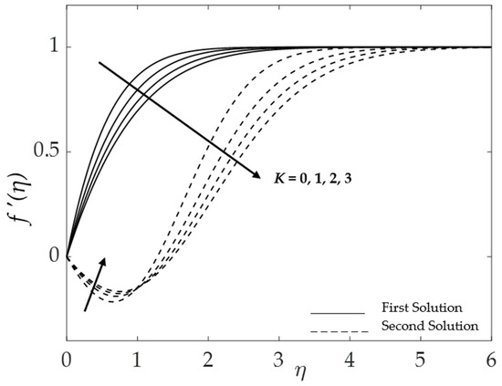 Influence of K on f ’(η) when M = 1, Bi = n= 0.5, ϕ1 = ϕ2 = 0.01, and λ = 1.
