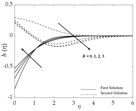 Influence of K on h(η) when M = 1, Bi = n = 0.5, ϕ1 = ϕ2 = 0.01, and λ = 1.