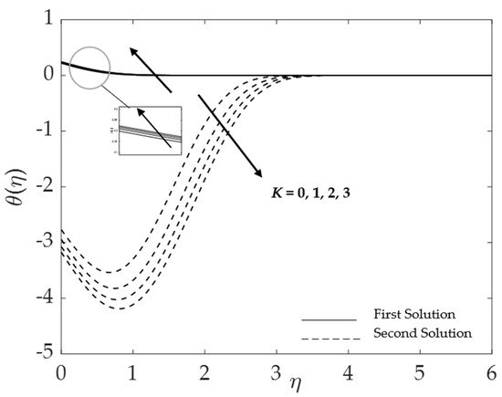 Next, the effects of the material parameter K on the velocity , microrotation , and temperature profiles when M = 1, Bi = n = 0.5, ϕ1 = ϕ2 = 0.01, and λ = 1 are illustrated in Figure 4, Figure 5 and Figure 6. It is noticed that the velocity and microrotation profiles decrease by increasing the micropolar effects for both solutions. However, for the velocity profile , the profile increases for the range of for the second solution and then monotonically decreases for the range , as depicted in Figure 4. Figure 5 represents a similar pattern to Figure 4, but the profile increases in the beginning for the range for the first solution and then monotonically decreases for the range . In addition, the rise of K leads the momentum boundary layer thickness to increase because of the dynamic viscosities that take place, as well as the vortex effects. Nonetheless, the temperature profiles present the opposite behaviors, as shown in Figure 6. The temperature escalates for the first solution and reduces for the second solution when K is increasing. This discovery is also consistent with those of Waini et al. [24] for velocity and temperature profiles, but for the microrotation profiles, the results are in contrast.
