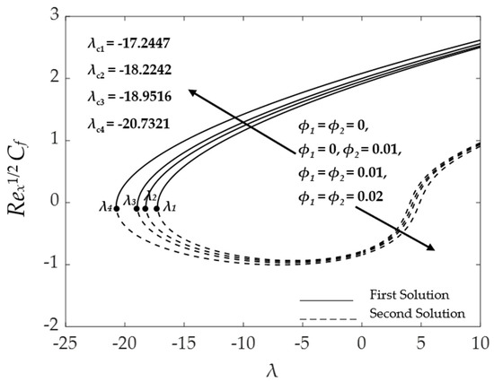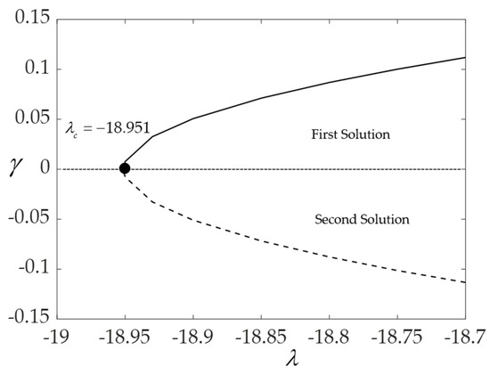 A stability analysis is performed to determine which one of the solutions is stable and which one is not. The eigenvalues are found in (19), and these smallest eigenvalues are illustrated in Figure 20 over the stretching or shrinking parameter when , Bi = n = 0.5, and . It is clearly showing the first solution has positive while the second solution has negative , respectively. It is also noticed that, as , this means that at turning points (from the first to the second solution), there is a change in the values of from stable (positive) to unstable (negative). Thus, this validates the stability analysis in the current work, and hence, it is probable that the first solution is more stable than the second solution.