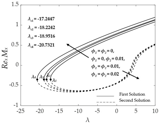 Figure 7, Figure 8 and Figure 9 elucidate the influences of the hybrid nanoparticles volume fraction on the values of , , and , respectively, for the various values of M = 1, Bi = n = 0.5, and . It is discovered that critical value for the pure water is −17.2447, for the nanofluid is −18.2242, and for the HNF are −18.9516 and −20.7321, respectively. Figure 7 and Figure 8 illustrate a similar profile pattern as the hybrid nanoparticles volume fraction increases will augment the values of and for the first solution but reduce for the second solution. It is noted that, between those base fluid, nanofluid, and HNF, the highest critical value is HNF . This is because the augmentation of the nanoparticles’ volume fraction will improve the viscosity performance of the fluid as well as enhance the surface shear stress, leading to an increase in local skin friction . Additionally, Figure 9 shows that the inclines to the larger value of nanoparticle volume fraction for the first solution as well. However, for the second solution, the value declines for the opposing region and rises for the assisting region as the increase. The addition of nanoparticles in the base fluid ( HNF) exerts more energy and raises the temperature, as well as increases the boundary layer thickness. This discovery proves that the HNF has greater heat transfer enhancement compared to nanofluid and water.